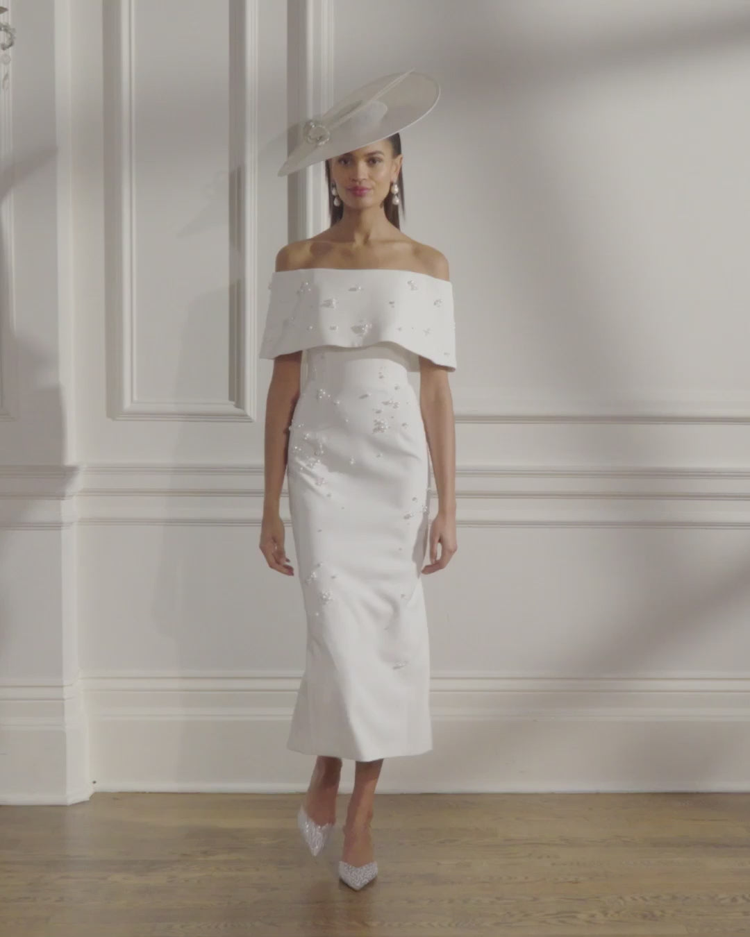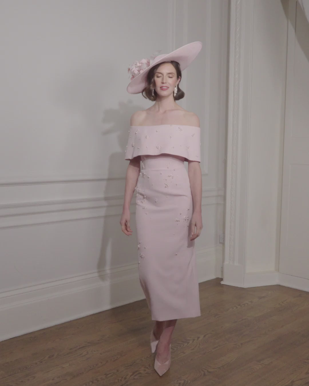 Classic and polished, this fitted crepe midi dress features a wide bardot neckline that elegantly frames the shoulders. Clusters of tonal pearls adorn the silhouette, adding refined texture and understated shimmer. With its timeless shape and luxurious detailing, this design is an elevated choice for the Mother of the Bride or Groom who favours effortless sophistication.