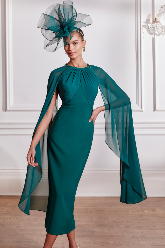 A sophisticated pencil midi dress in crepe, featuring chiffon draping across the bodice that flows into elegant cape sleeves. Tonal beading delicately adorns the neckline, adding a touch of refined detail to this chic design.
