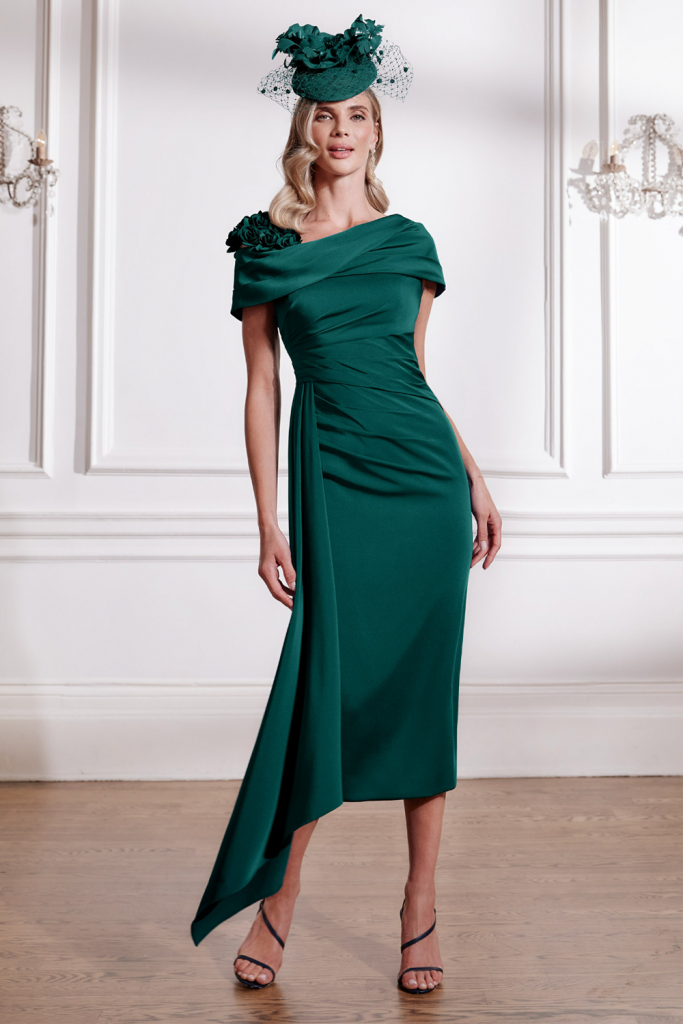 A fitted crepe dress featuring flowing crepe down one side for added movement. The ruched bodice and twisted asymmetric neckline create a flattering silhouette, while 3D flowers on one shoulder add a feminine and elegant touch.
