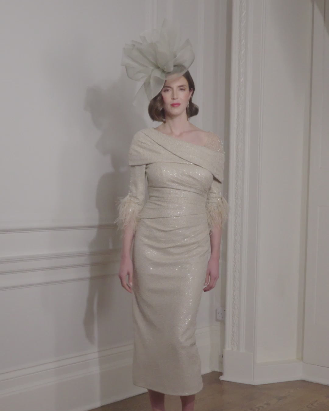 Dramatic yet sophisticated, this luxe sparkle dress flatters with soft ruching across the bodice and a beautifully sculpted silhouette. The asymmetric neckline features illusion beading for a delicate touch of shimmer, while the ¾ sleeves are finished with tonal feathers and beading to elevate the design further. A glamorous choice for the Mother of the Bride or Groom who loves refined statement style.