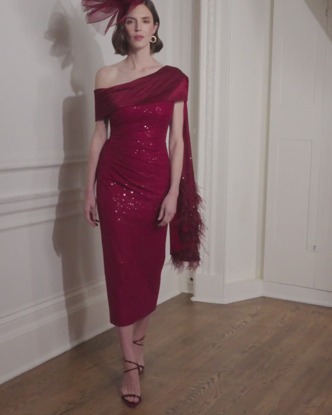 Dramatic and glamorous, this fitted sparkle dress features a striking asymmetric neckline in tonal satin, blending texture and sheen. A flowing draped cape adds elegant movement, finished with delicate feathers and beading at the hem for a luxurious touch. Bold yet sophisticated, this design is perfect for the Mother of the Bride or Groom seeking a standout silhouette.