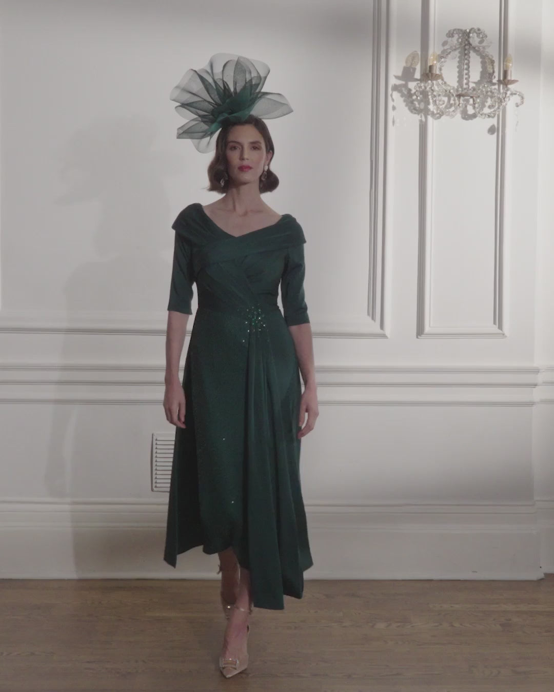 A sophisticated blend of texture and silhouette, this design pairs a fitted sparkle underlayer with a flowing crepe A-line overskirt. The beaded waist draws the eye and defines the silhouette, while the soft drape of crepe cascading down the front brings refined elegance. Completed with an on-the-shoulder neckline and ¾ sleeves, this style is perfect for the Mother of the Bride or Groom seeking polished glamour.