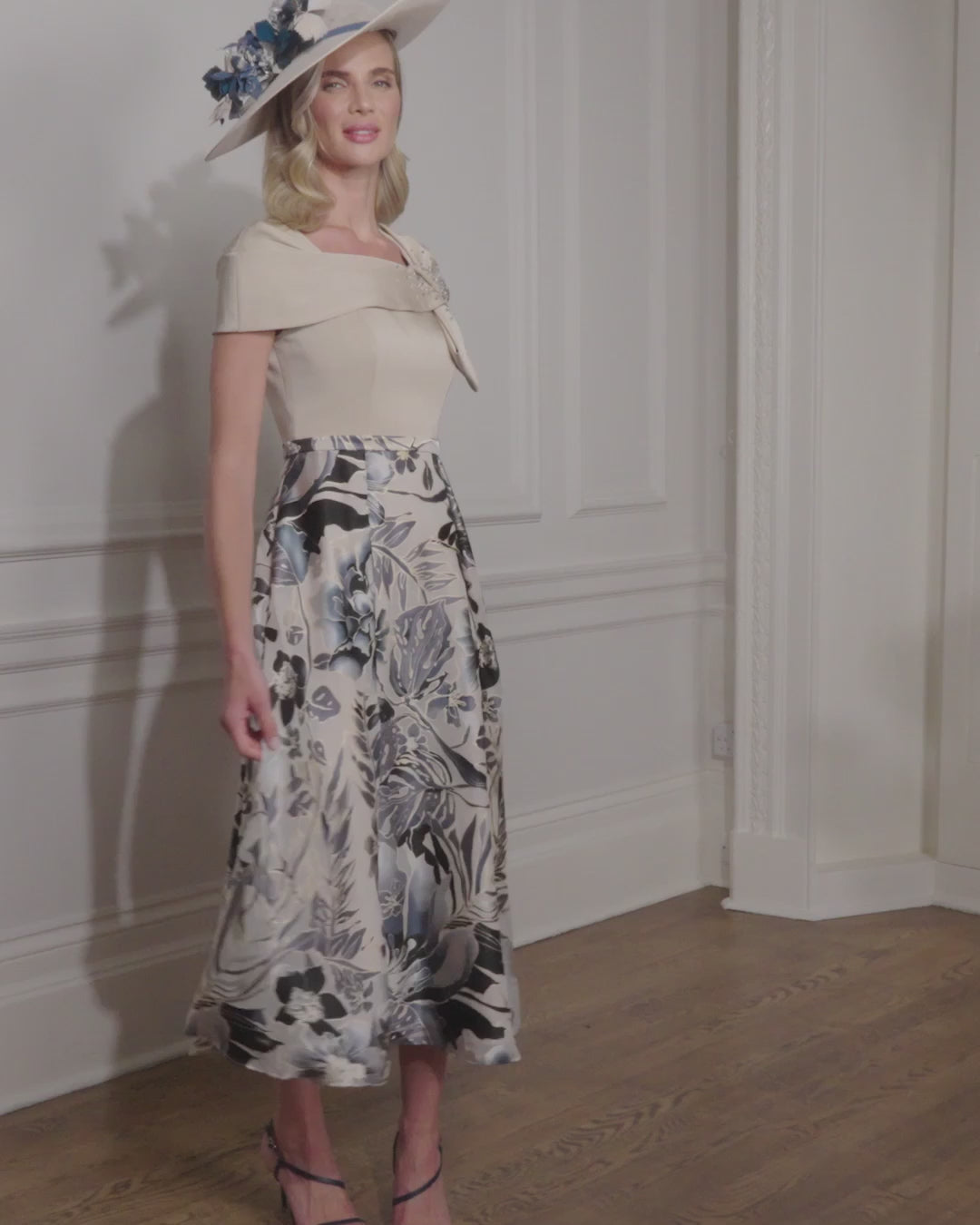 A beautifully refined A-line silhouette, this dress pairs a floaty burnout printed skirt with a contrasting crepe bodice for a modern textural balance. The neckline twists into an elegant bow at one shoulder, adorned with delicate beaded embellishments for added sparkle. Graceful, feminine and unique, this design offers timeless charm for the Mother of the Bride or Groom.
