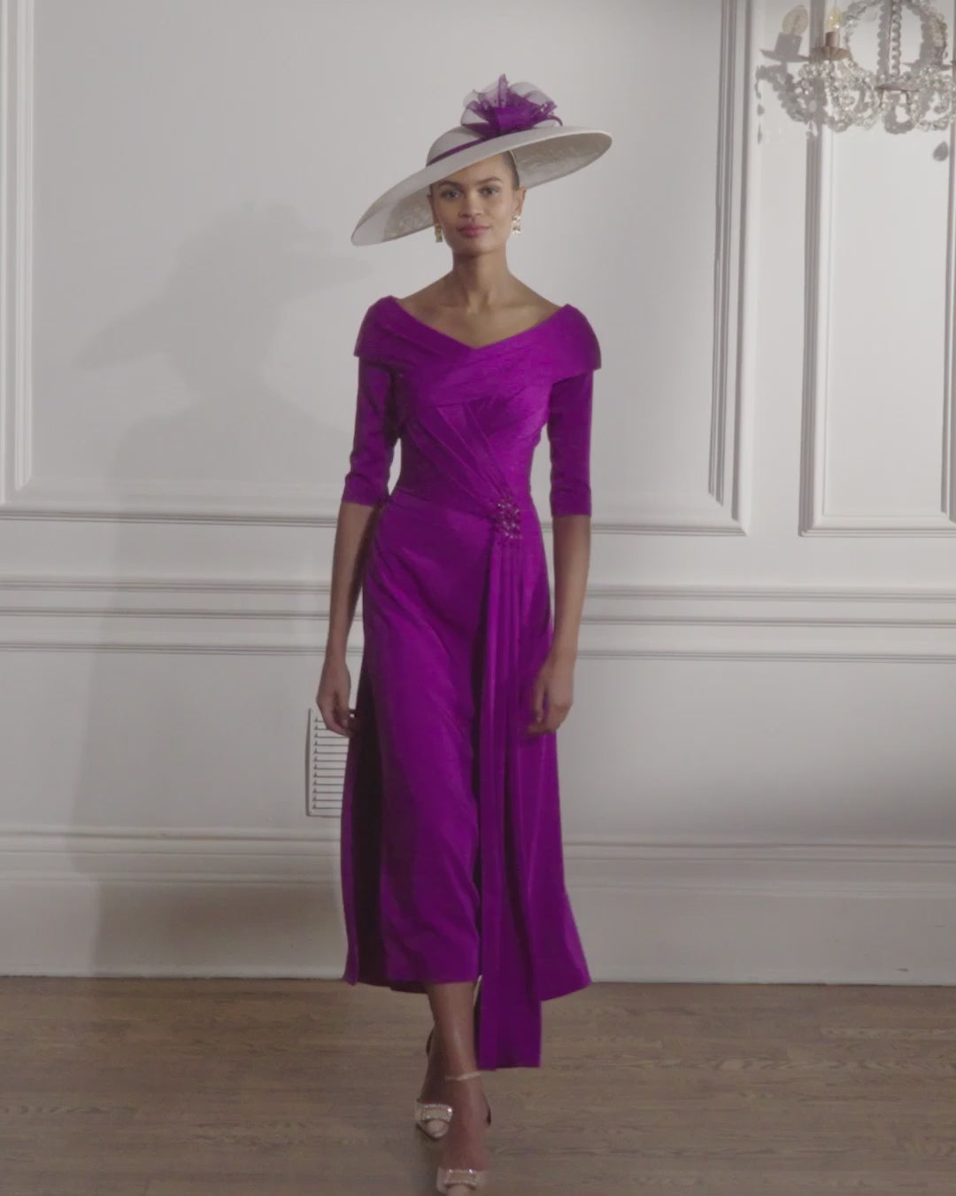 Sophisticated and timeless, this elegant all-crepe A-line dress features a flowing overskirt that adds movement and dimension to the silhouette. Beaded detailing at the waist brings subtle sparkle, while the on-the-shoulder neckline and ¾ sleeves create a polished finish. A graceful and refined choice for the Mother of the Bride or Groom.