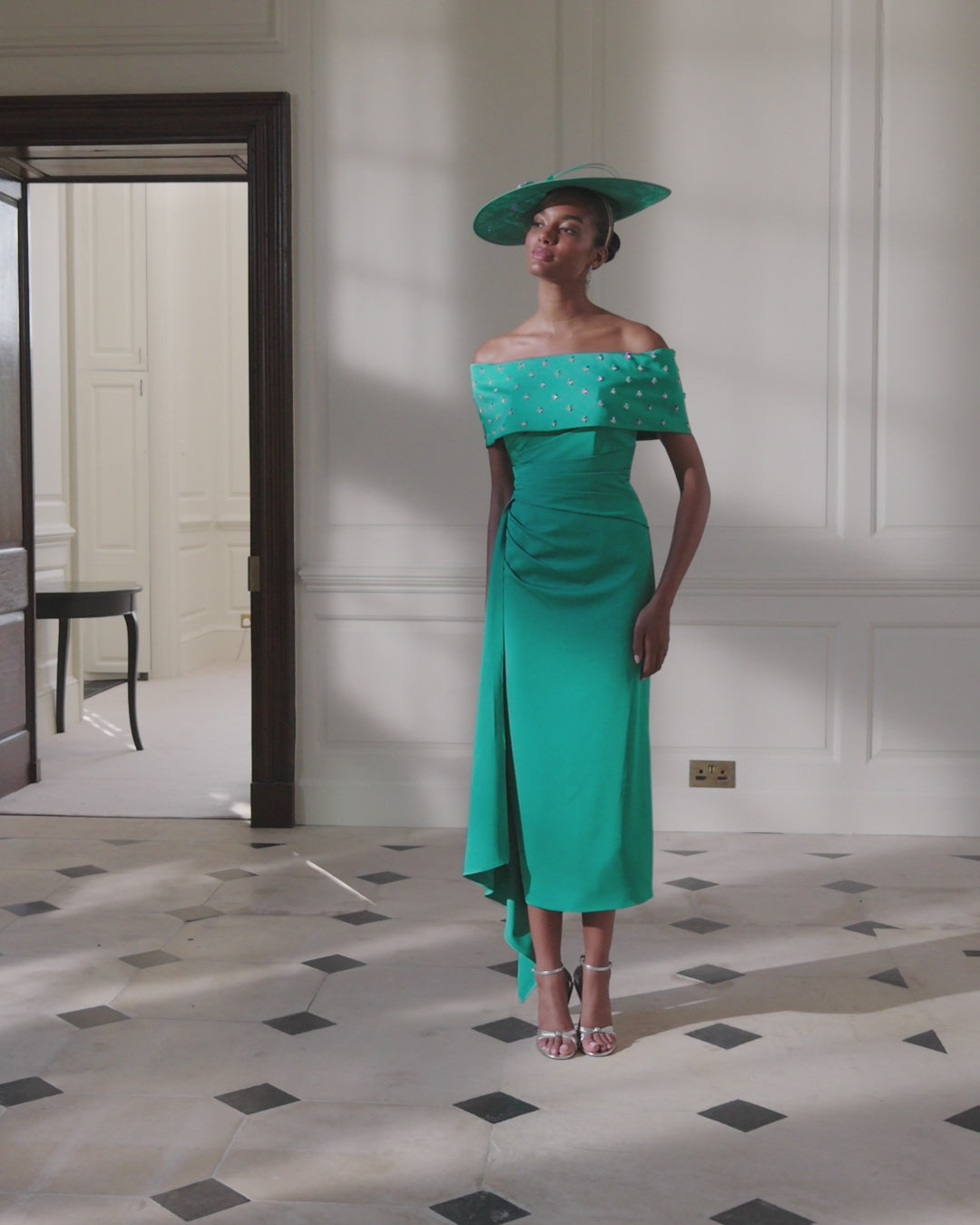 This exquisite bardot dress pairs timeless design with subtle sparkle. The off-the-shoulder neckline elegantly frames the décolletage, while a cascade of crepe flows softly down one side, adding graceful movement. Clusters of clear crystals illuminate the collar, creating a look that feels both glamorous and understated.