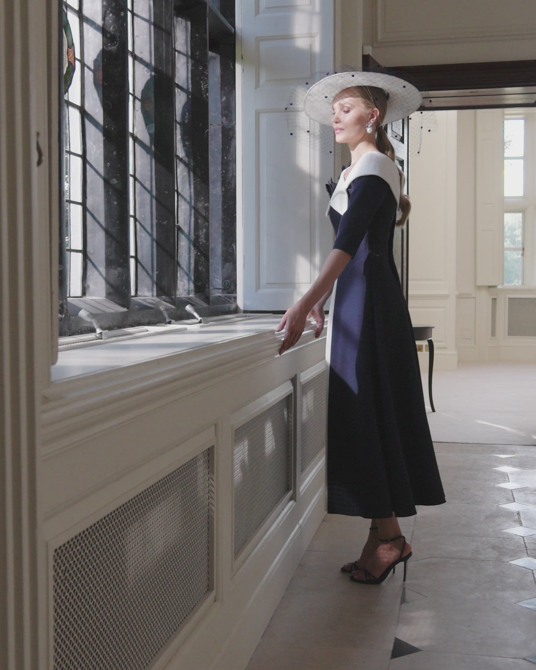 This effortlessly chic A-line dress combines simplicity with subtle detail. Crafted from smooth crepe, the silhouette is elevated by a fluid chiffon insert that brings gentle movement to the skirt. A contrasting collar and delicate handcrafted flowers at the shoulder add a touch of artistry.