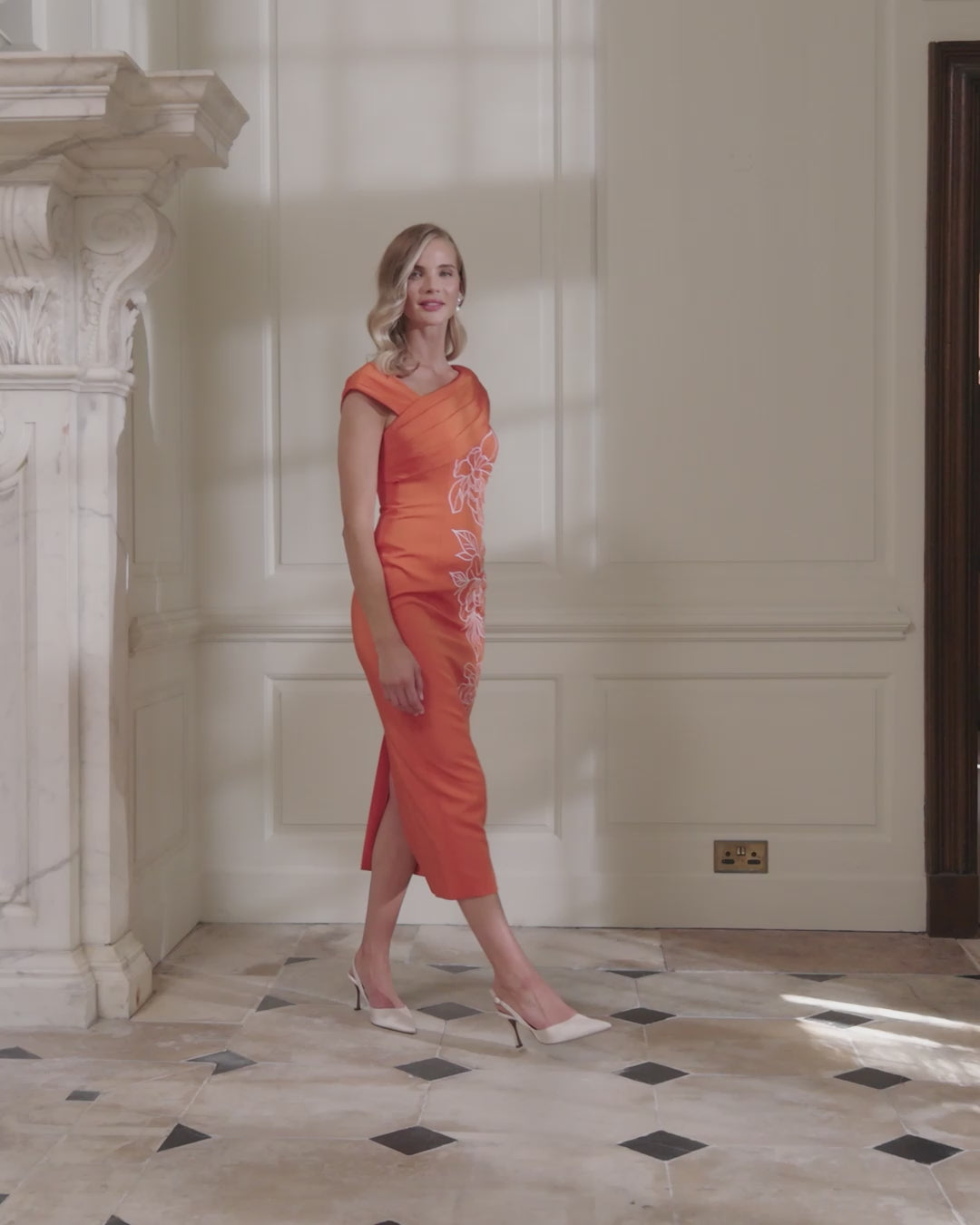 Bold yet refined, this fitted crepe midi dress makes a statement with striking contrast floral embroidery that adorns the silhouette. The asymmetric collar and single shoulder strap add contemporary structure, creating a balance of sophistication and modern flair. A perfect choice for the Mother of the Bride or Groom who loves effortless confidence.