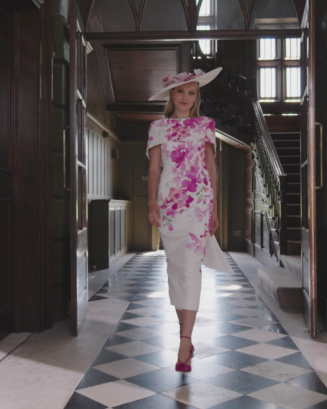 This elegant luxe crepe dress is designed with a delicate watercolour floral print that enhances its refined aesthetic.