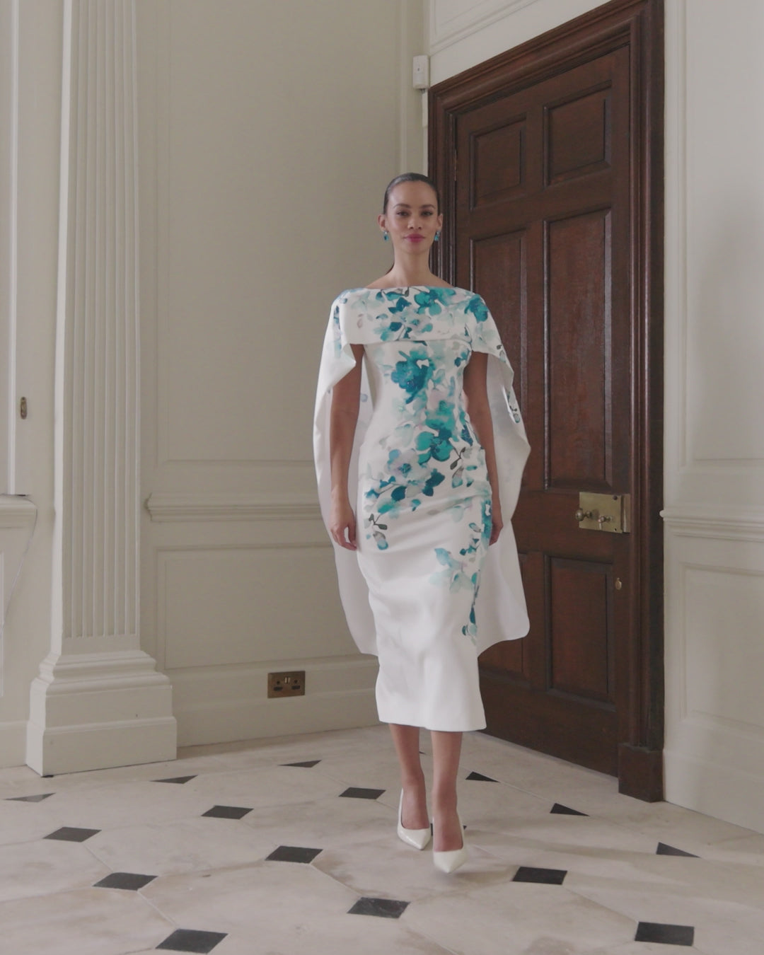 A fitted midi pencil skirt and contoured seams flatter the silhouette, while a statement print cape adds fluidity and movement.