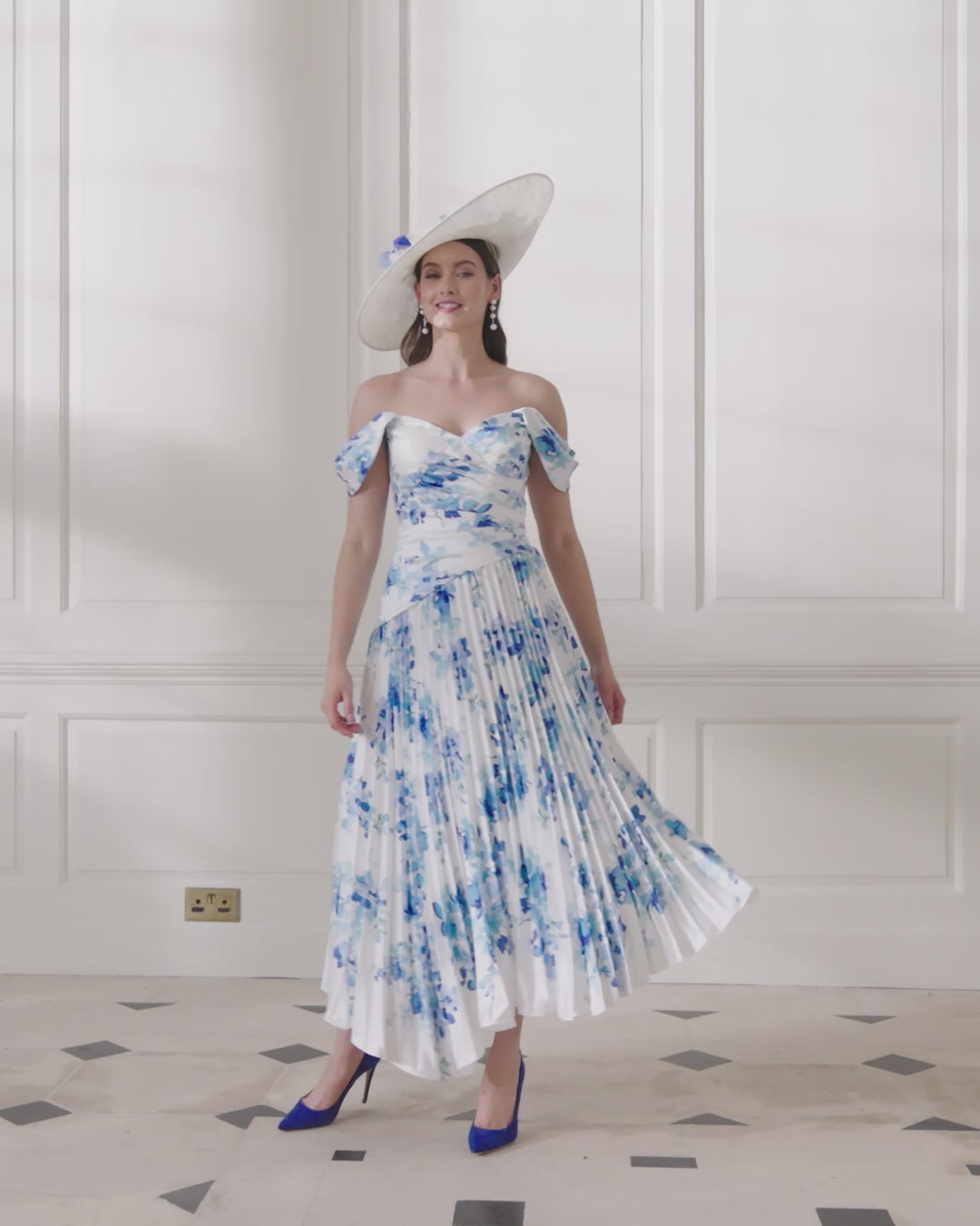 Crafted in lightweight printed crepe, this midi dress captures effortless femininity. The sweetheart neckline and off-the-shoulder straps beautifully frame the décolletage, while the softly pleated skirt adds delicate movement. A refined and romantic choice for the Mother of the Bride or Groom who appreciates timeless elegance with a modern touch.