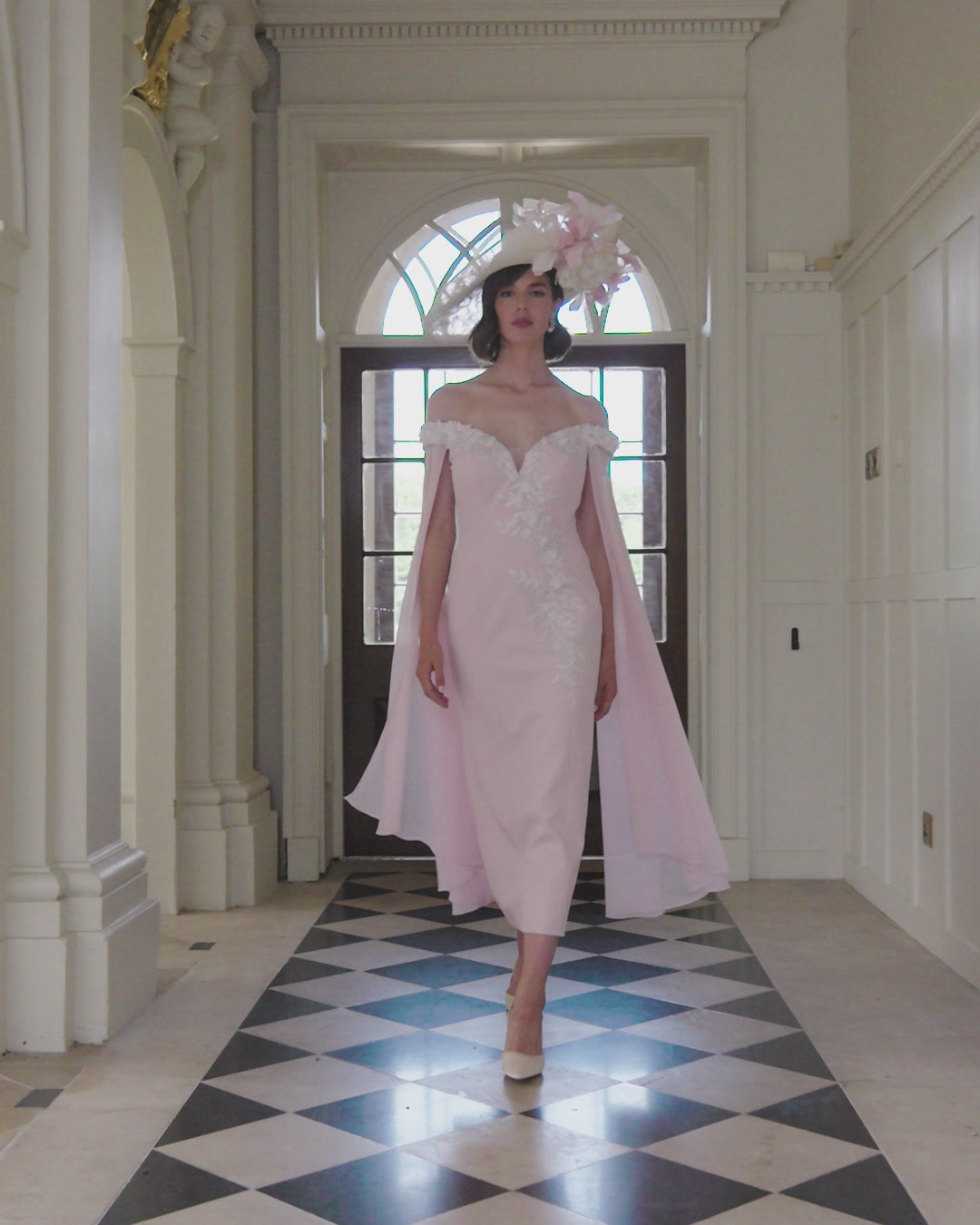 This luxurious crepe midi dress is elevated by its soft chiffon cape sleeve, adding gentle movement and flow. The design is beautifully finished with delicate 3D floral lace and embellishment, creating texture and light-catching detail. A timelessly elegant choice for the Mother of the Bride or Groom.