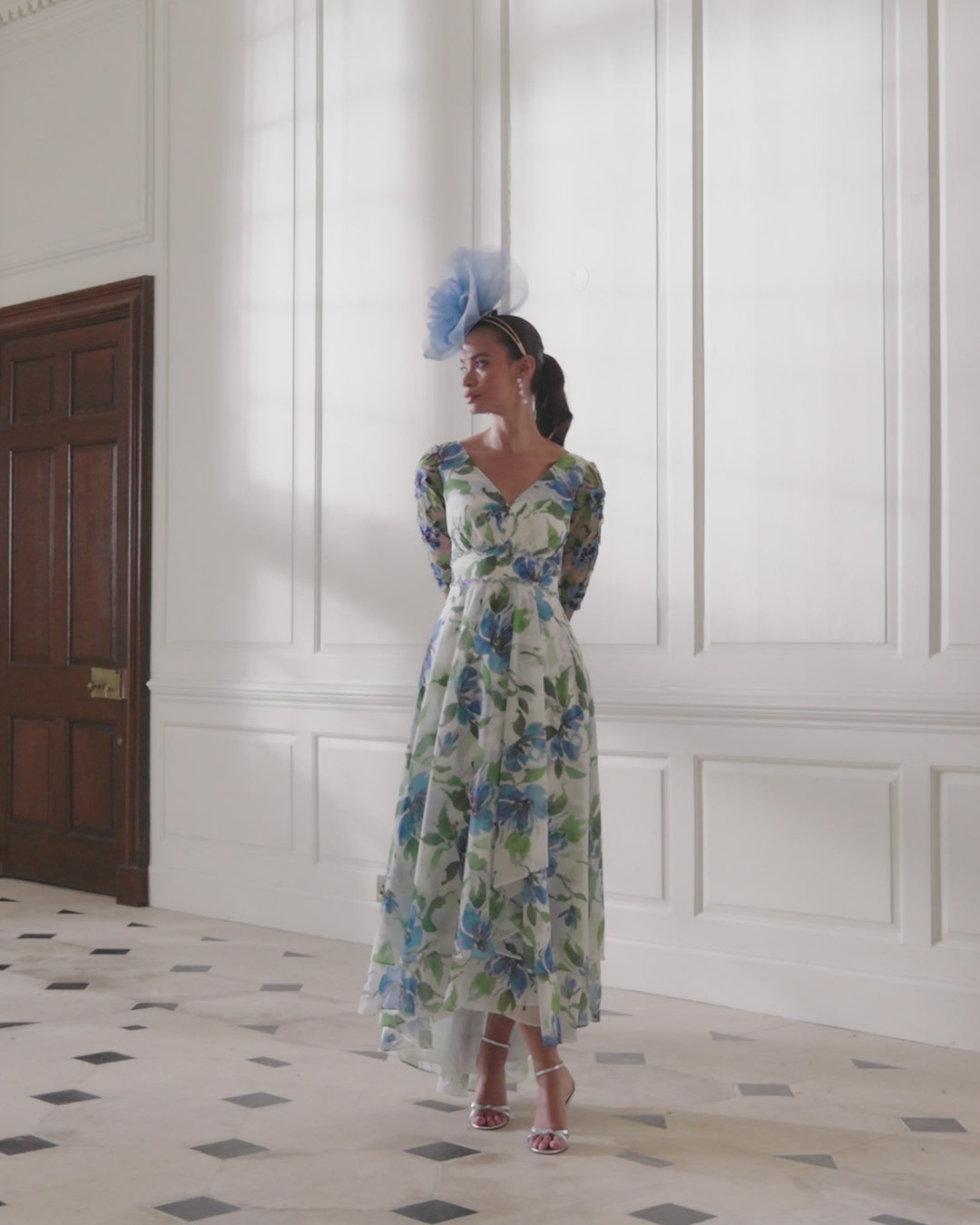 Crafted from delicate printed chiffon, this dress is both flattering and refined. The v-neckline and lace sleeves enhance the feminine silhouette, while a beaded waistline adds subtle sparkle and definition. Perfect for the Mother of the Bride or Groom who values timeless elegance and understated charm.