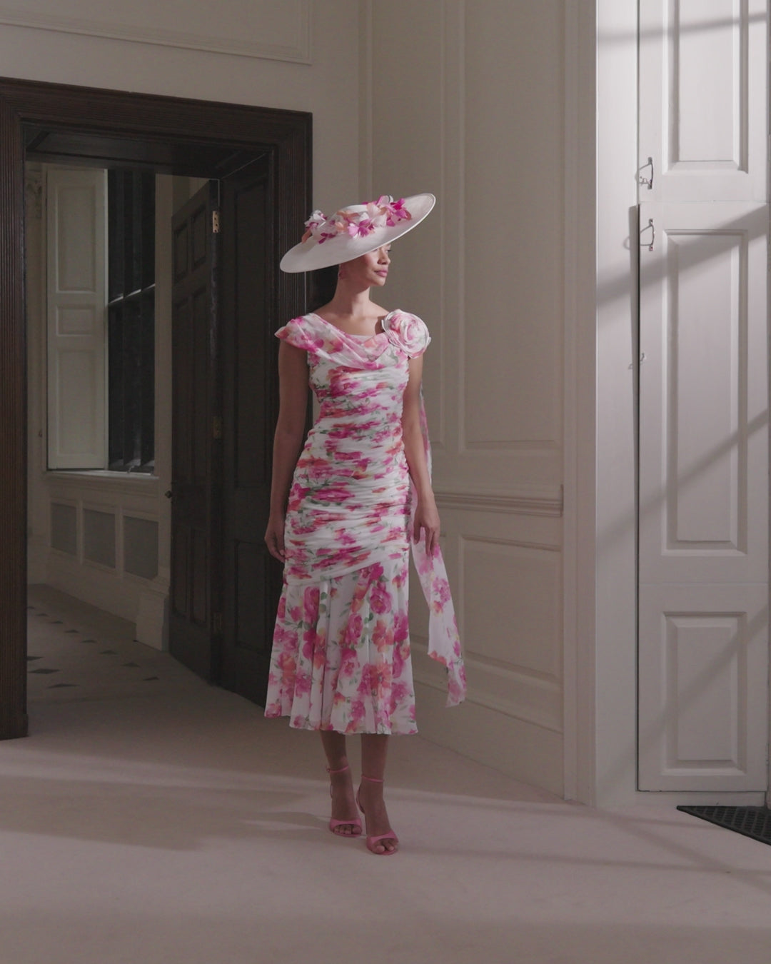 Crafted from printed chiffon, this cowl neck dress combines soft draping with flattering structure.